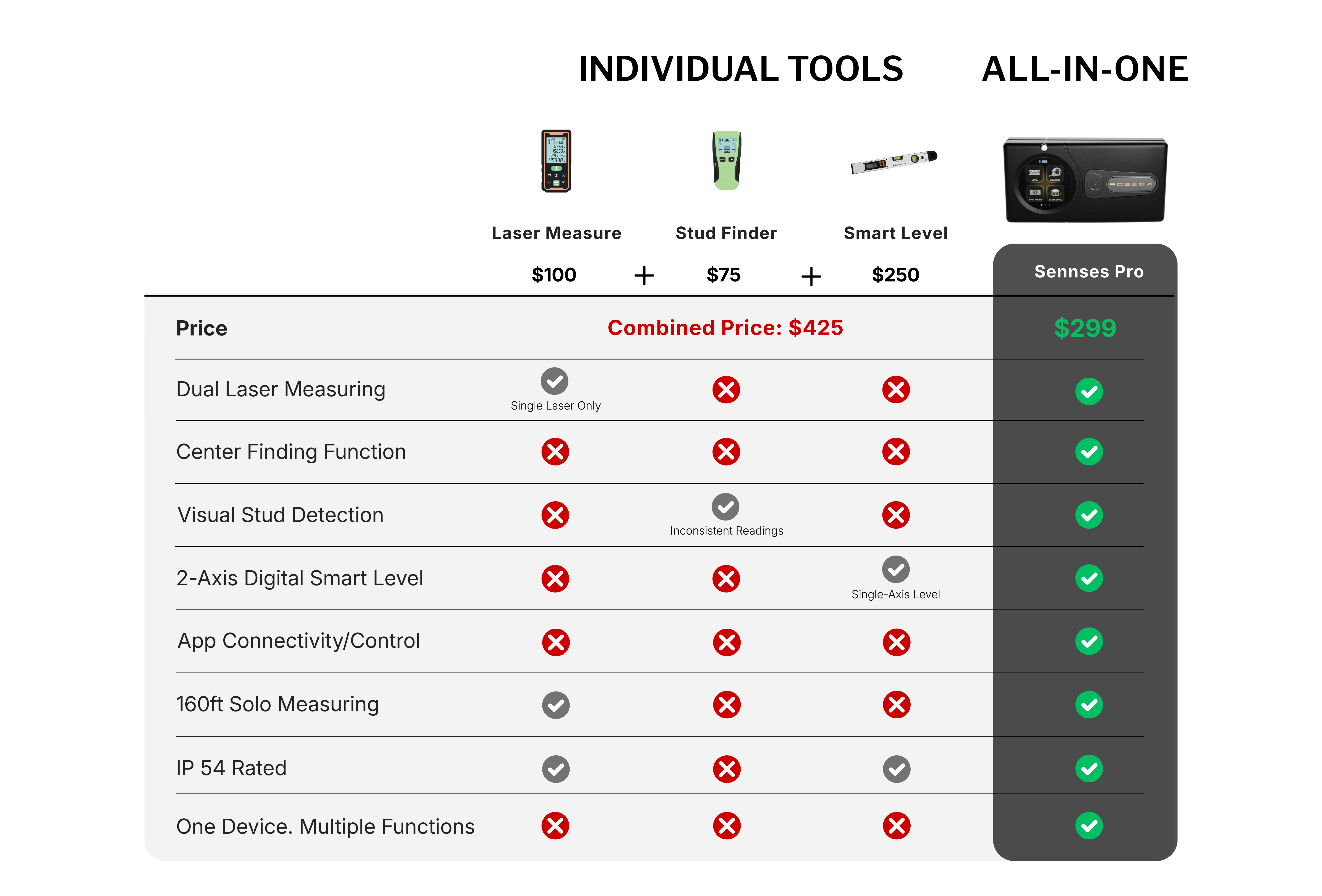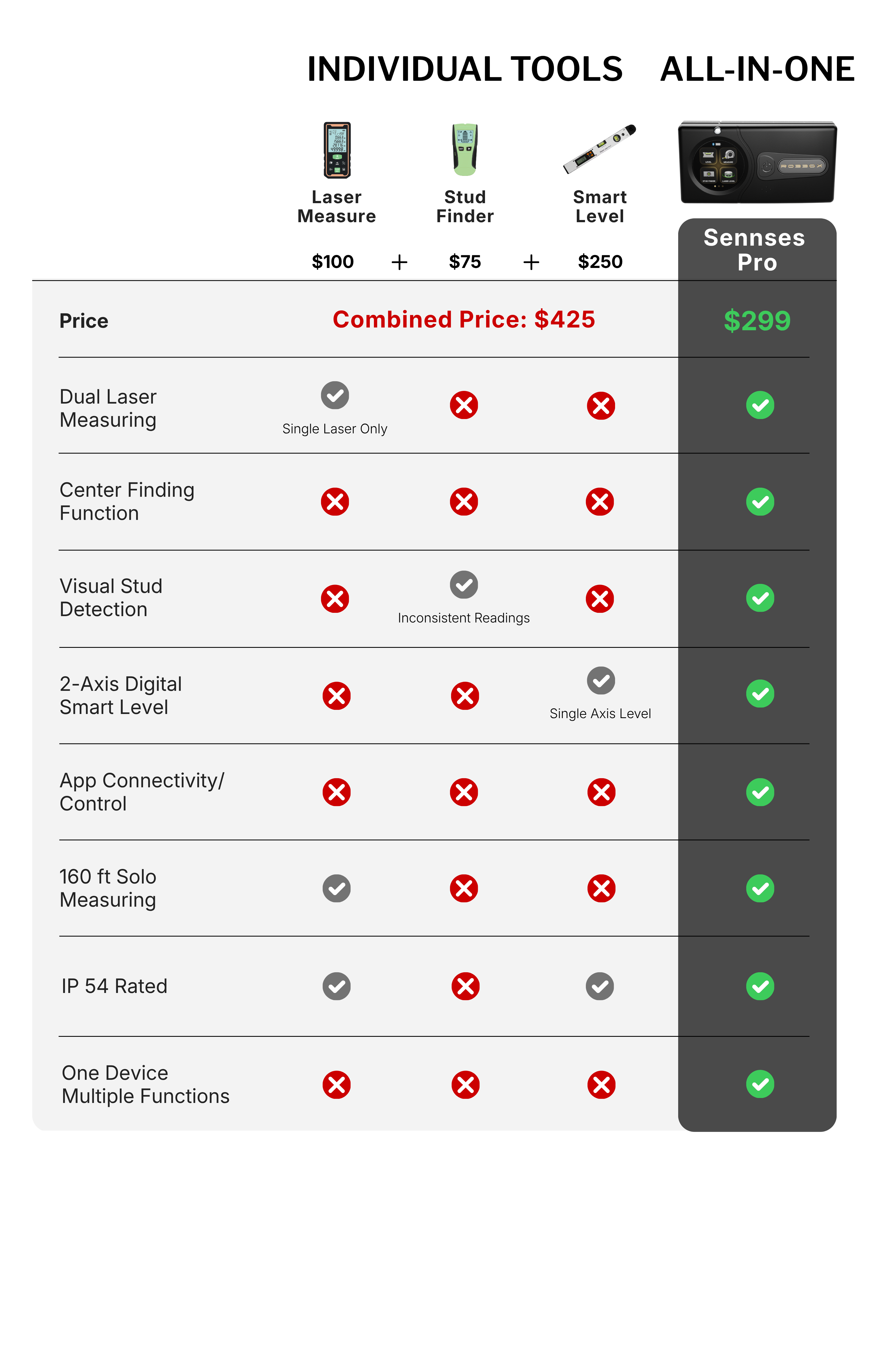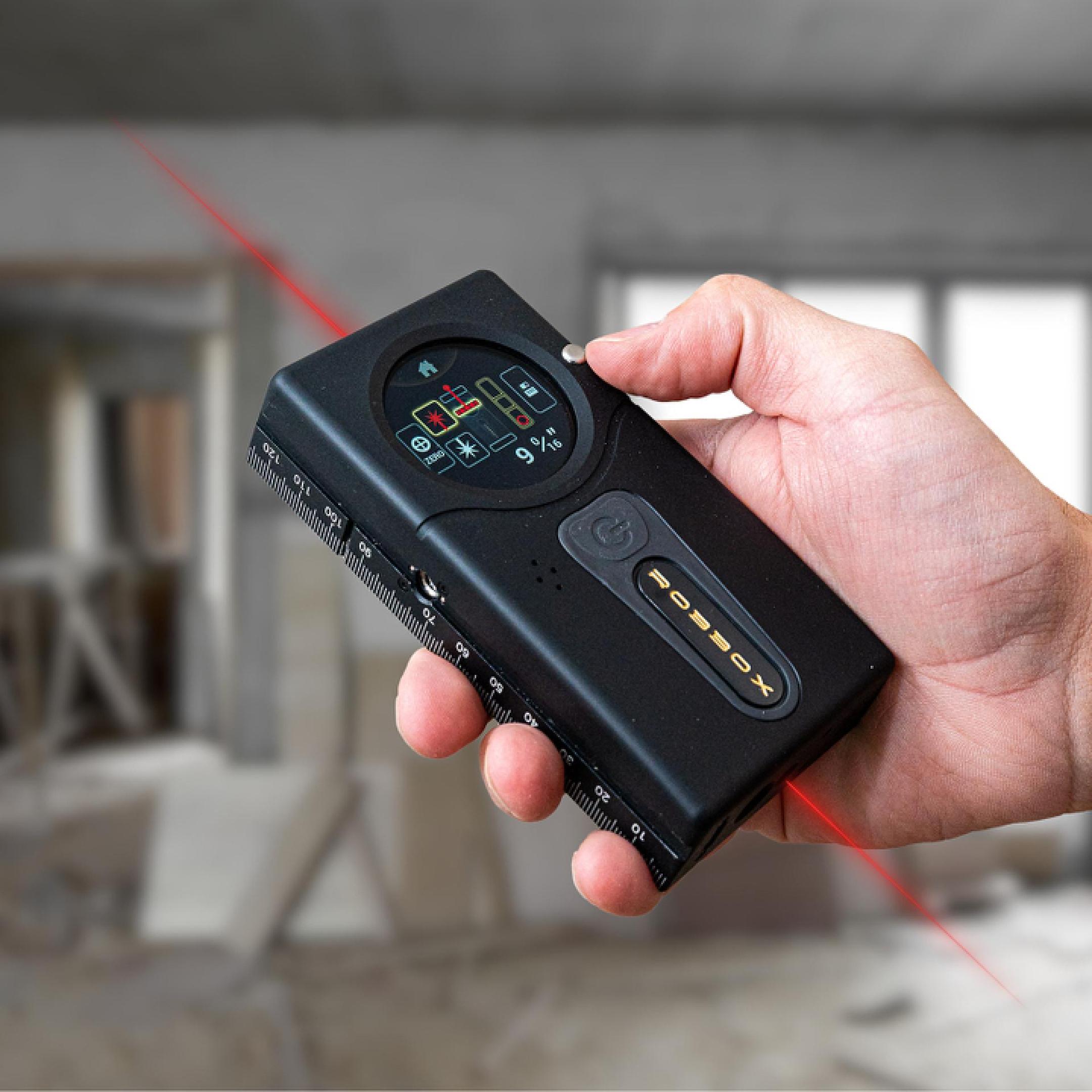Measure and find center points with laser precision, level perfectly, and detect studs—all from one durable smart device.